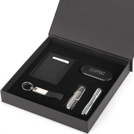İçerik: 9101 - Clipper Kutulu Metal Çakmak, 9535 - Deri Cüzdan, 4103 - Deri-Metal Anahtarlık, 9252 - Çakı, Fener